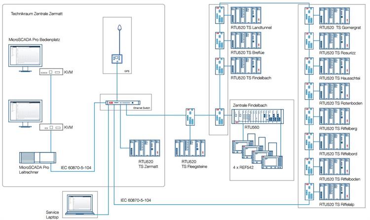A control equipment upgrade concept was designed in close cooperation with GGB and is based on the IEC 60870-5-104 standard. The RTU200 and RTU20 units installed at the stations were replaced with new RTU560 and RTU520 units, which were connected to the new MicroSCADA Pro network control system at GGB. The MicroSCADA Pro system was installed on the ground floor of the switcing station in Zermatt.